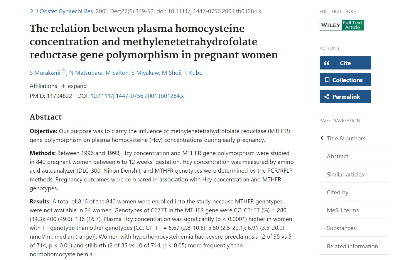 У 2002 році велике японське когортне дослідження (840 жінки, 6–12 тижнів вагітності), опубліковані в The Journal of Obstetrics and Гінекологічні дослідження закріпили ланцюжок: ТТ → Підйом Hcy → несприятлива вагітність результати.