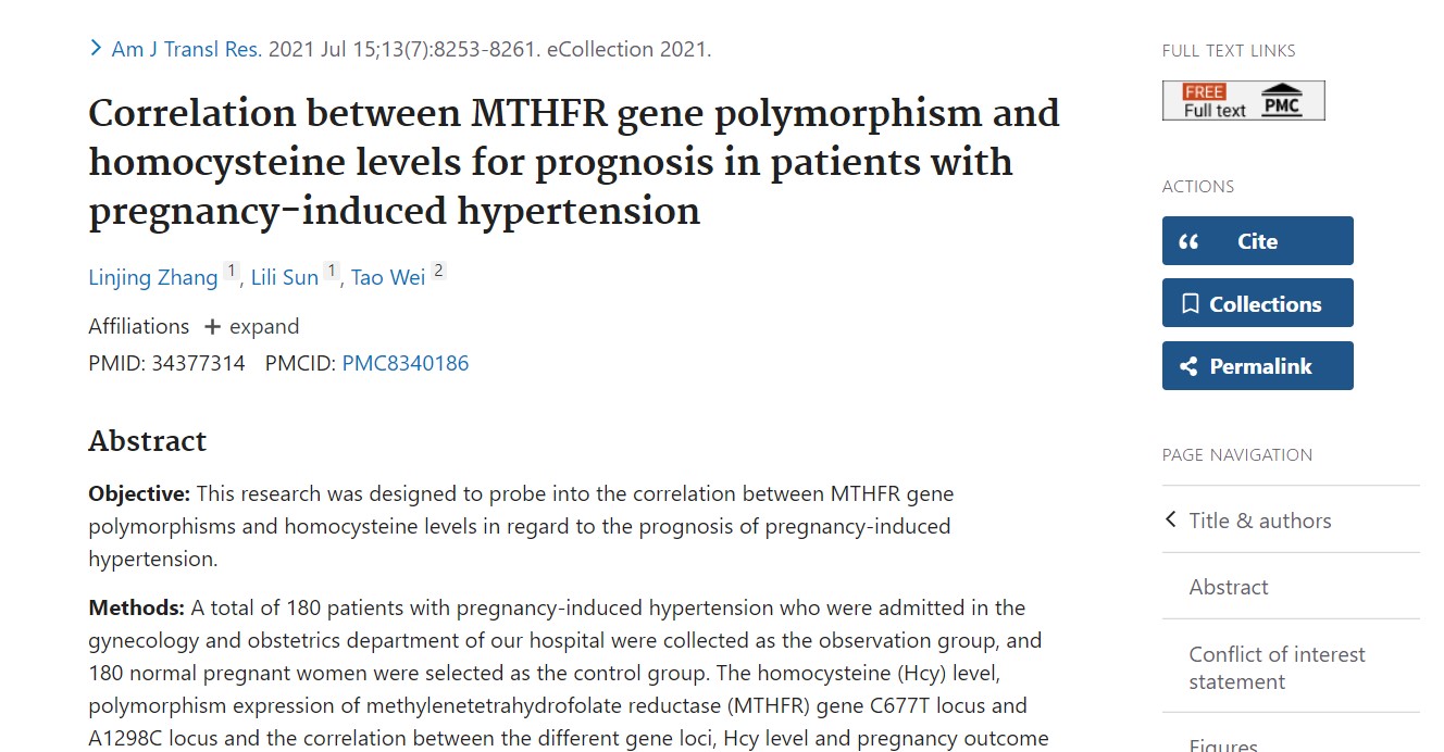 [1] Zhang LJ, Sun LL, Wei T. Кореляція між геном MTHFR поліморфізм і рівень гомоцистеїну для прогнозу у пацієнтів з гіпертензія, спричинена вагітністю. Am J Transl Res. 15 липня 2021; 13 (7): 8253-8261. eCollection 2021. PMID: 34377314; PMCID: PMC8340186.