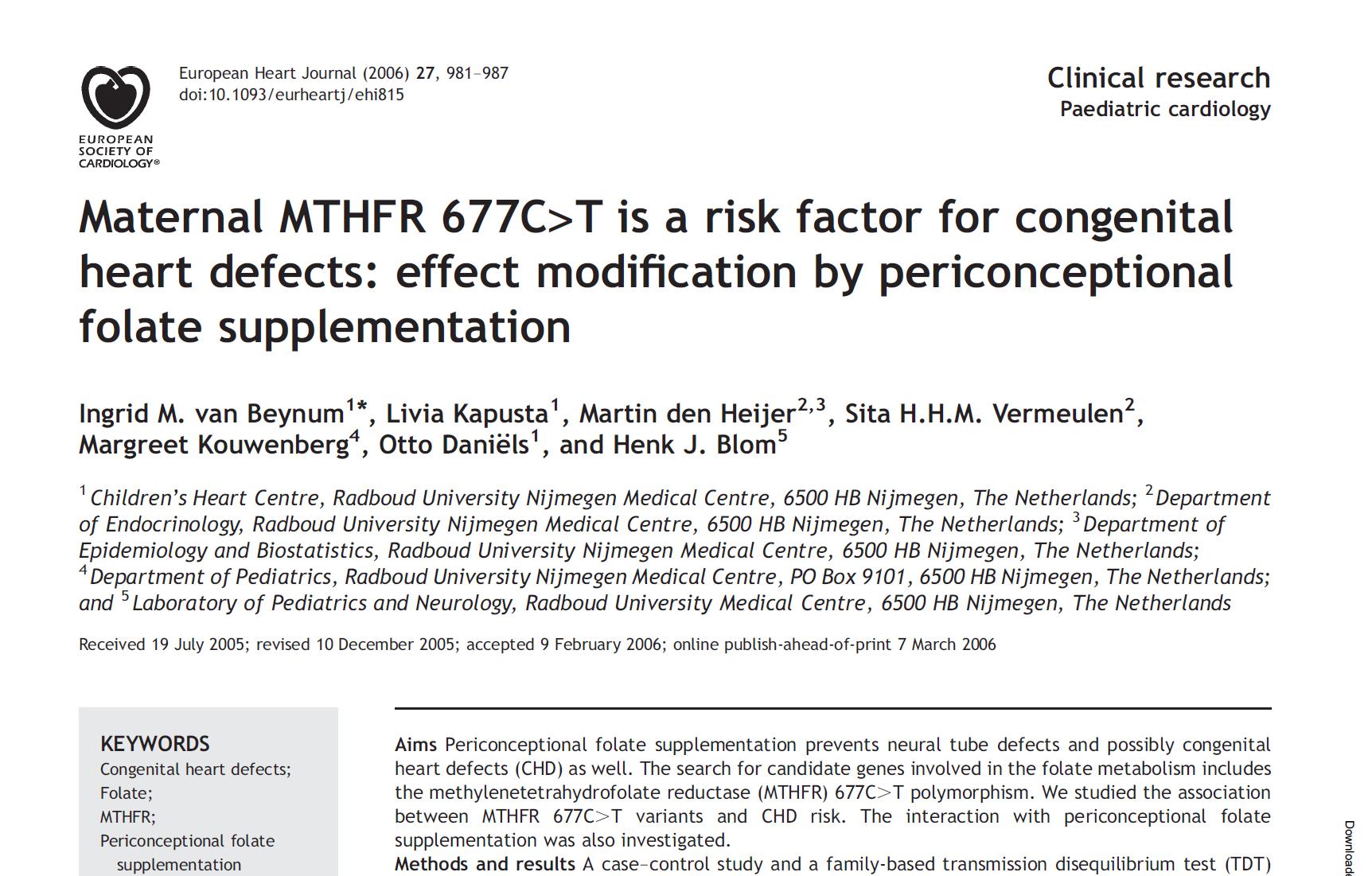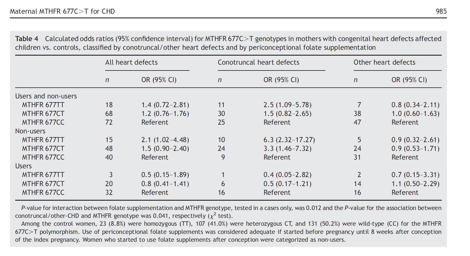 Серед 165 сімей з вродженими хвороби серця (ІХС) і 220 контрольних сімей, матері, які носили MTHFR 677 CT або TT генотип і НЕ приймали періконцепційні фолієві добавки набагато більше шансів мати дитину з вадами серця провідного типу (АБО 3.3 і 6.3 відповідно).