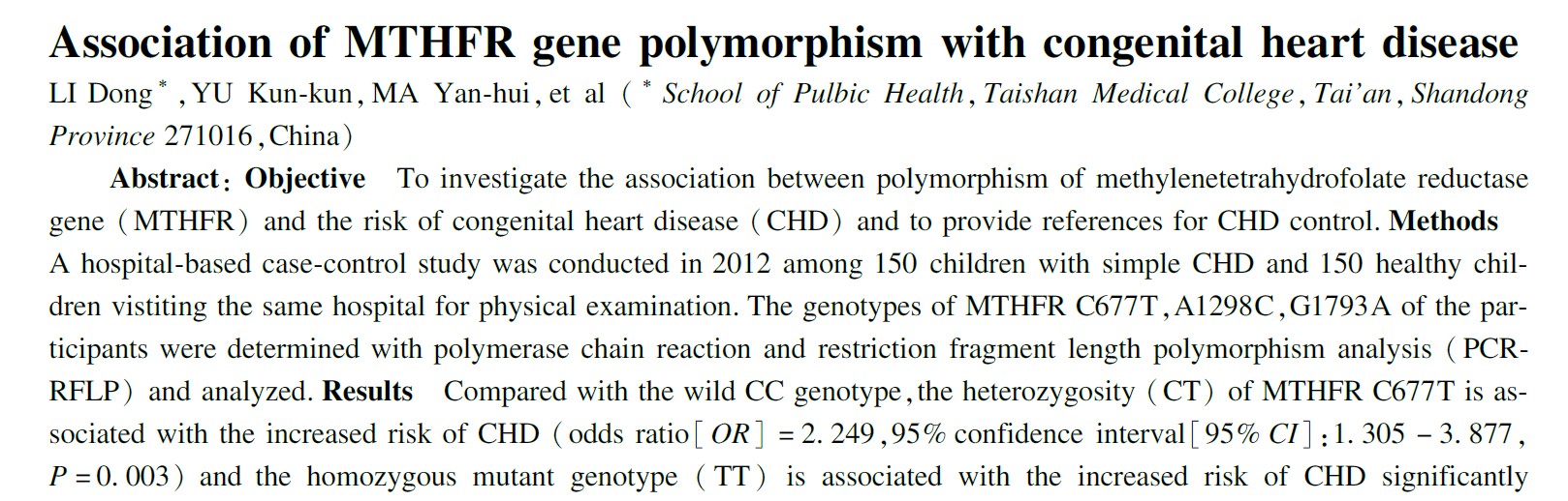 Дослідження дитячої лікарні Qilu в Шаньдуні Університет показав, що алель Т MTHFR C677T збільшує шанси на ІХС у 1,8 раза; Генотипи ТТ і СТ підвищують ризик у 3,1 і 2,2 рази.