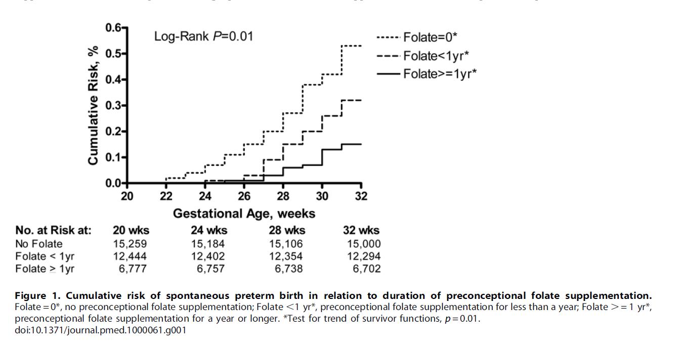 Різниці між ними майже не було три групи. Це вказує на те, що фолієва кислота запобігає лише «дуже ранній недоношеності». народження» і не впливає на передчасні пологи близько доношеного.