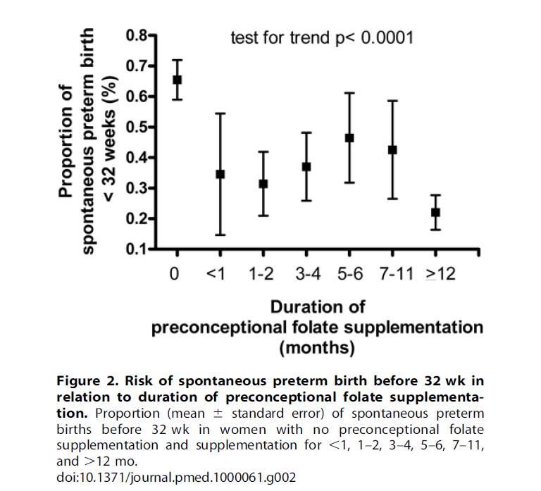 Більш критичний аналіз тенденцій показав: чим більше тривалість прийому добавок, тим менший ризик. Ризикуйте поступово зменшується з періодами прийому добавок 1-2 місяці, 3-6 місяців, 7-11 місяців, і ≥12 міс. Однак добавка в останню хвилину (лише на 1 місяць) є в принципі неефективно!