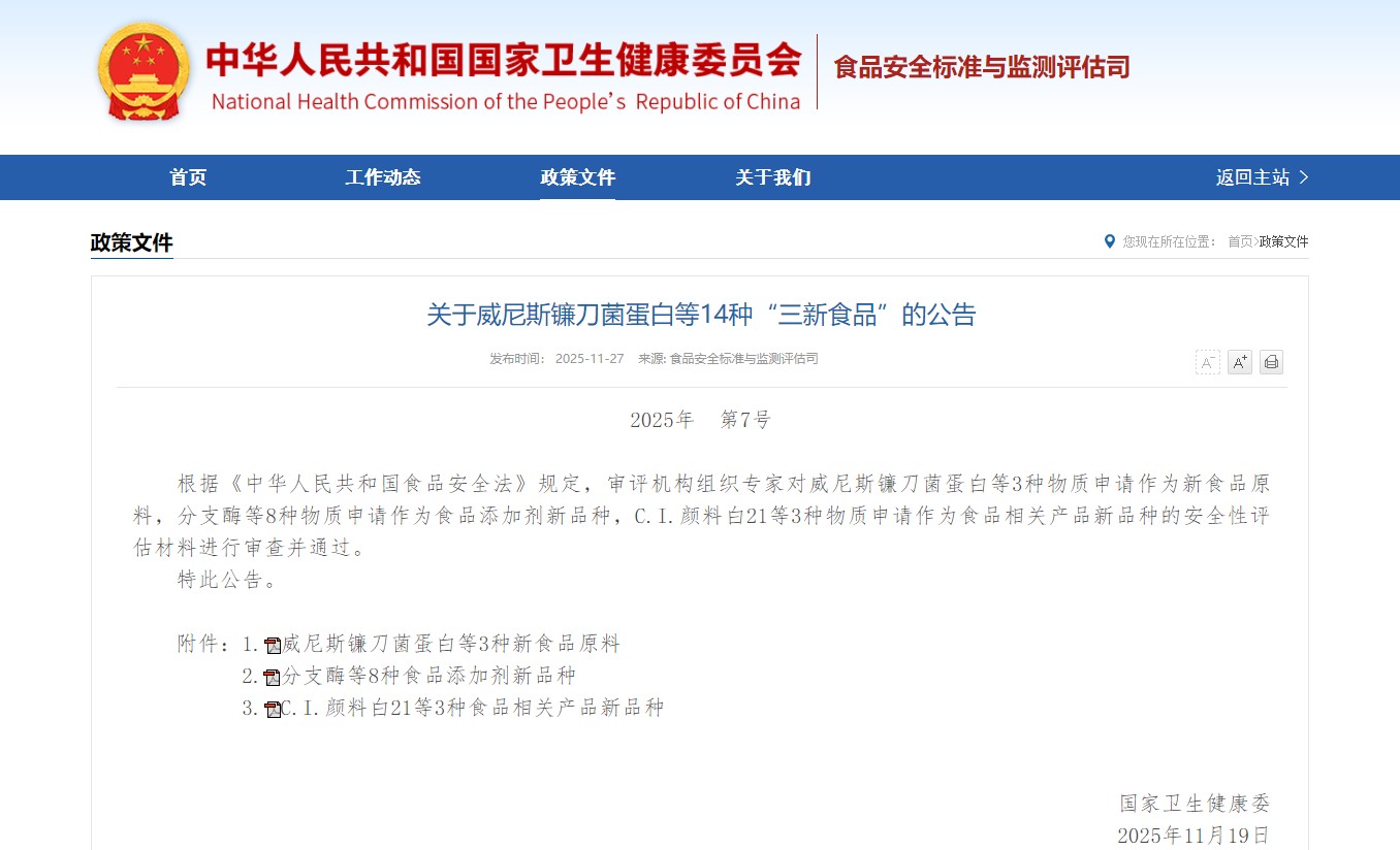 [1] Національна комісія охорони здоров'я Китайської Народної Республіки.Оголошення на 14 «Трьох нових продуктах харчування», включаючи венеціанський фузаріозний білок (2025 р., № 7).