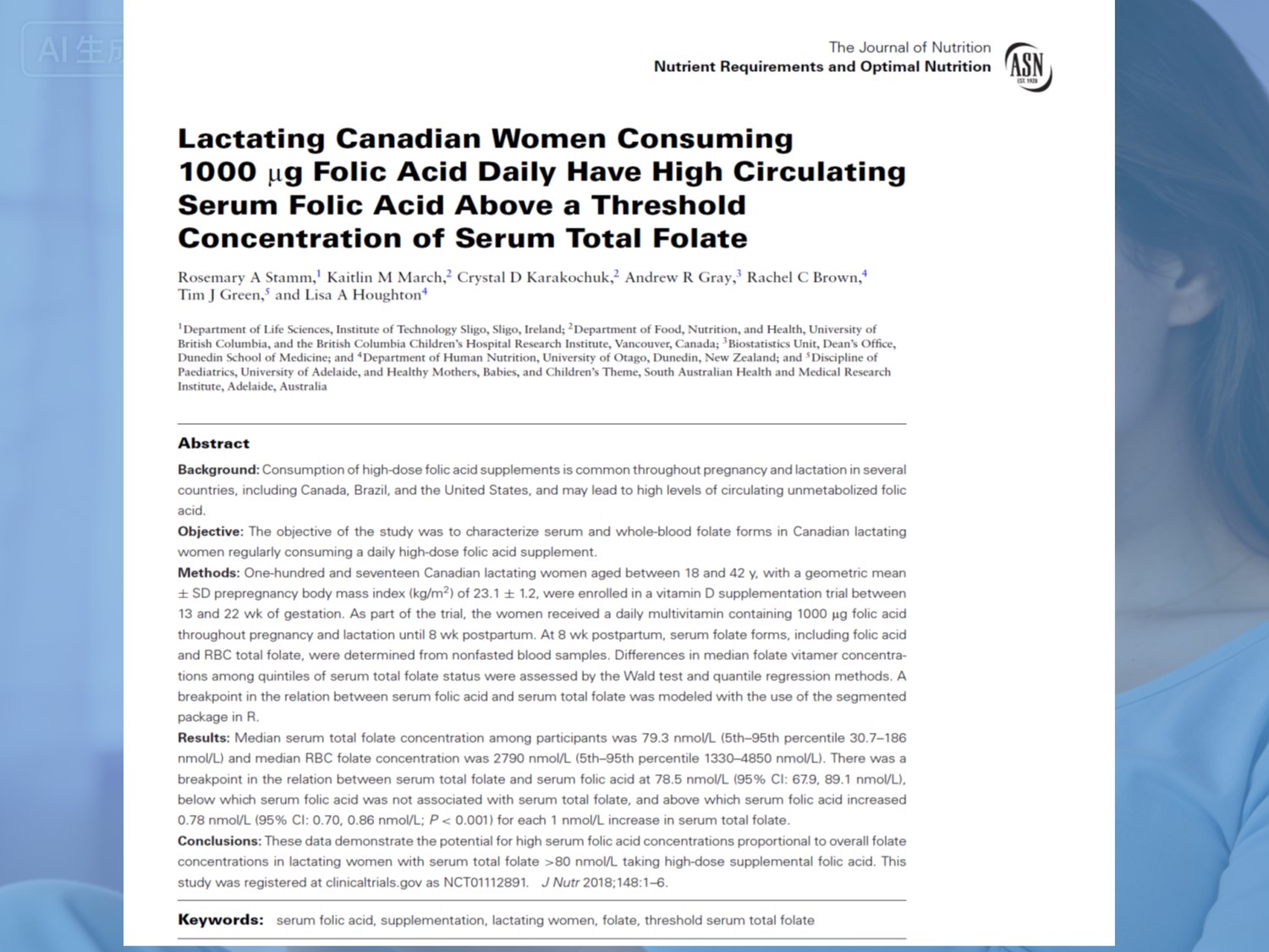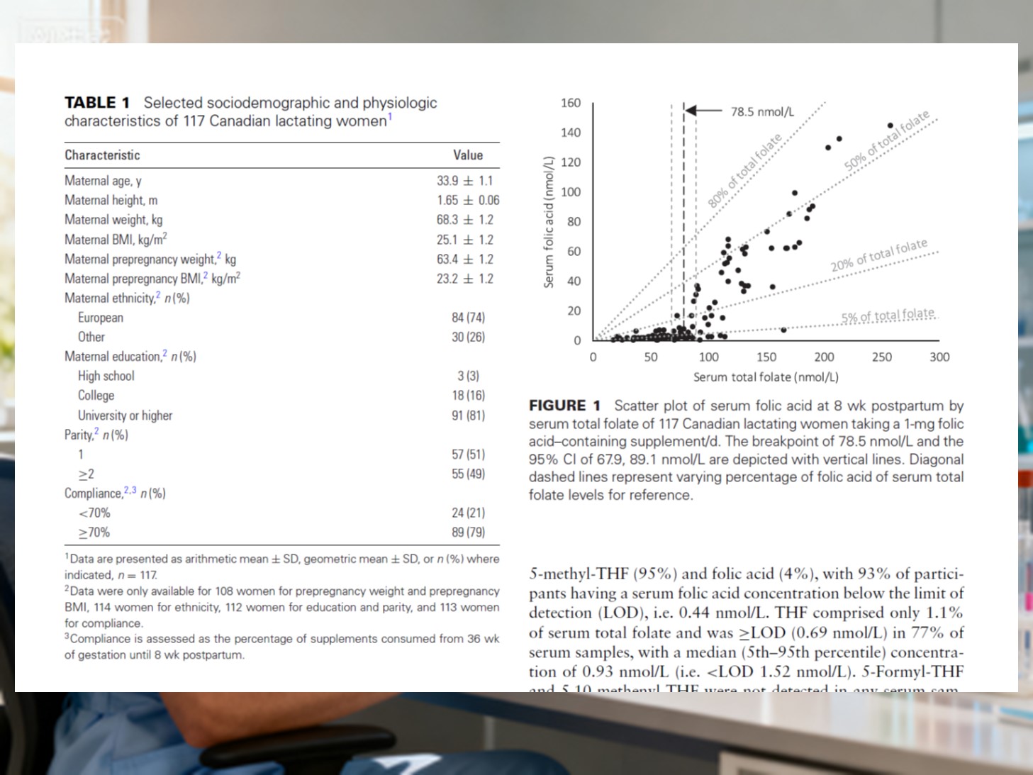 У дослідженні взяли участь 117 здорових жінок у період лактації. З середини вагітності далі вони взяли 1000 μг фолієвої кислоти плюс 12 μг вітаміну В₁₂щодня, продовжуючи до 8 тижнів після пологів. Зразки крові зібрані через 8 тижнів після пологів були проаналізовані на фолієві форми.