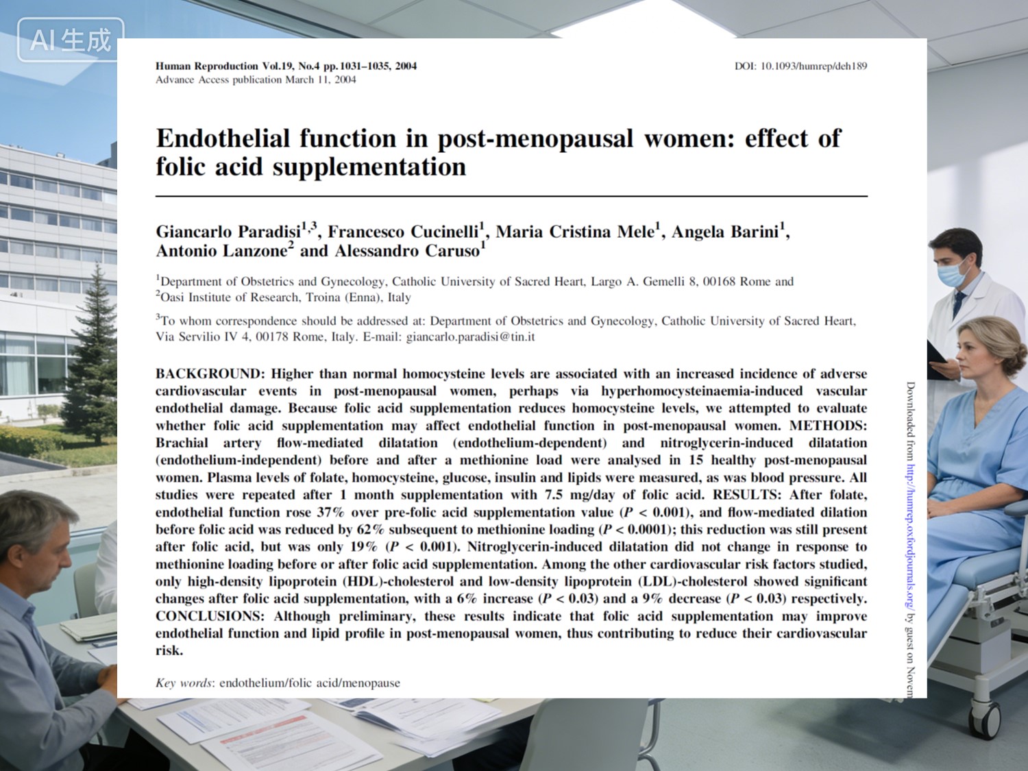 А знакове дослідження 2004 року, опубліковане в Відтворення людини (IF 6.1) за Джанкарло Парадізі, Франческо Кучінеллі та їхні колеги зосередилися саме на жінки в постменопаузі. П'ятнадцять здорових учасників, представник типових стан постменопаузи, взяли 7,5 мг/добу фолієвої кислоти протягом одного місяця. Результати показали помітні покращення: