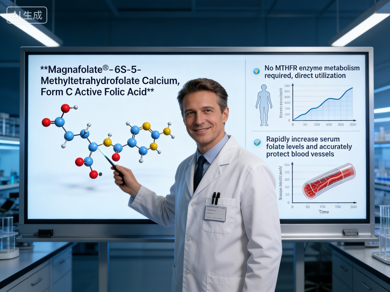 Магнафолат®, а 6S-5-метилтетрагідрофолат кальцію (кристалічний активний фолат), відповідає цьому основна клінічна потреба. Будучи природно активним фолатом, він вимагає немає ферменту MTHFR метаболізм і потрапляє в організм готовим до негайного використання, швидко приєднавшись до шляху розпаду HCY, щоб усунути це“мовчазний абразивний”судин. Він швидко підвищує рівень фолієвої кислоти в сироватці крові рівнів, що забезпечує своєчасний цілеспрямований захист судин, ідеально підходить для ферментативні зміни в постменопаузі, тим самим усуваючи“доповнювати, але не поглинати”проблема.