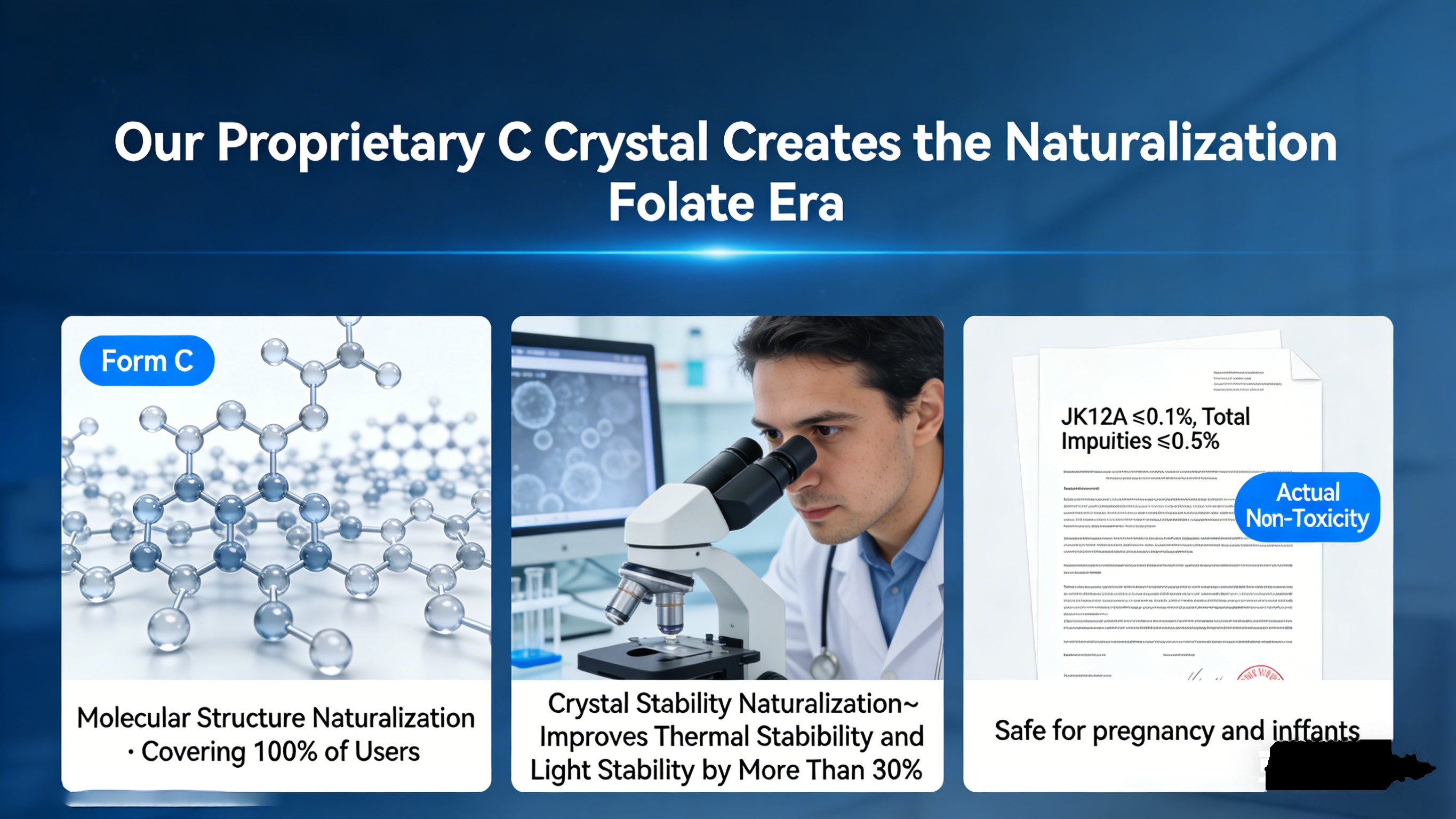 Запатентований C-Crystal Naturalization Фолієва кислота: Наш глобальний патент кристалічна форма активного фолату та перший у світі натуралізований фолат категорія. Безпека наближається до фолату харчового походження. Залишається стабільним при кімнатній температурі та значно перевищує рівень контролю якості для вагітних і немовлят вітчизняні та міжнародні фармакопеї. Представляє останнє оновлення в фолієва технологія.