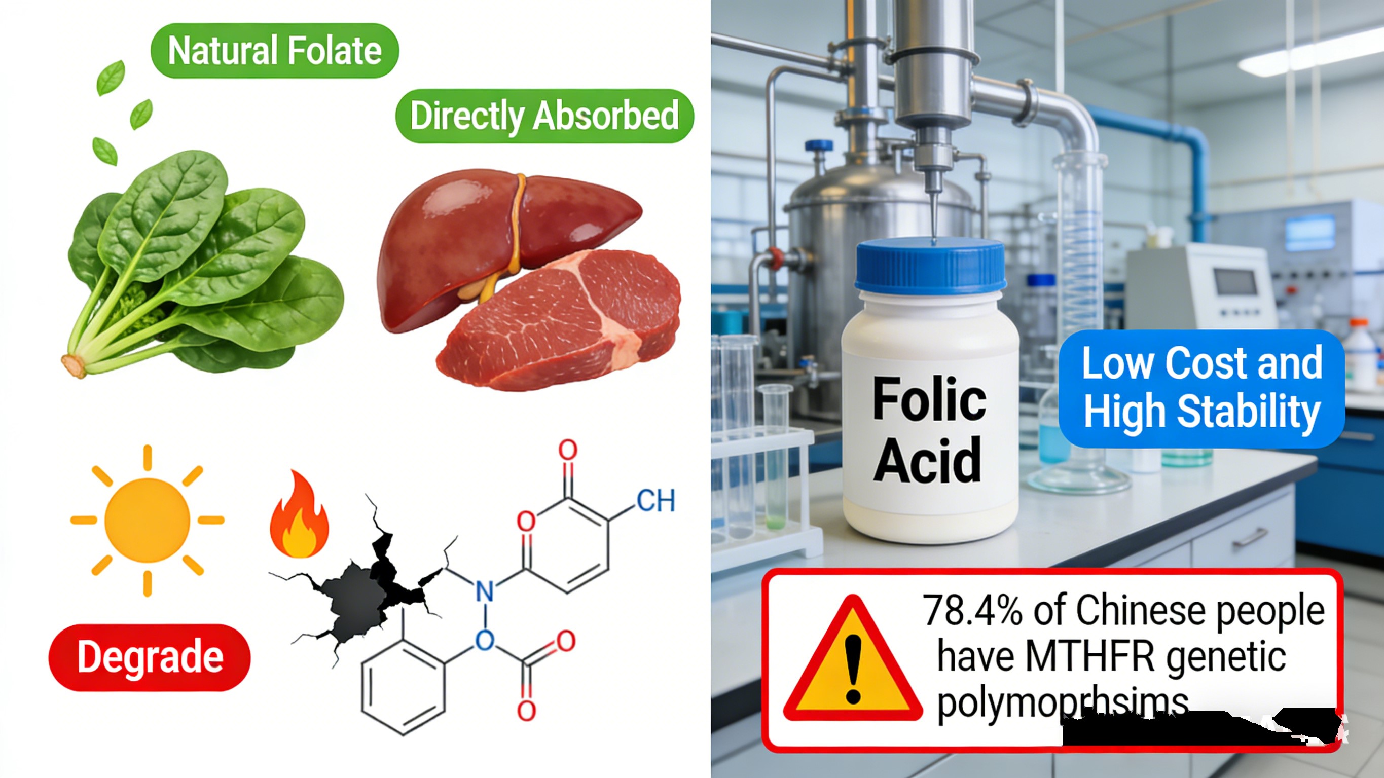 Проте триваючі клінічні та харчові дослідження показали її ахіллесова п’ята: фолієвій кислоті не вистачає внутрішньої фізіологічної активності, і вона повинна пройти чотири етапи ферментації, щоб стати абсорбованим. Мої 19 років у R&D шоу реальний вплив у Китаї: 78% населення має ген MTHFR поліморфізм, у тому числі 28% з вираженим порушенням метаболізму — ферментативної активності лише 30% особин дикого типу.