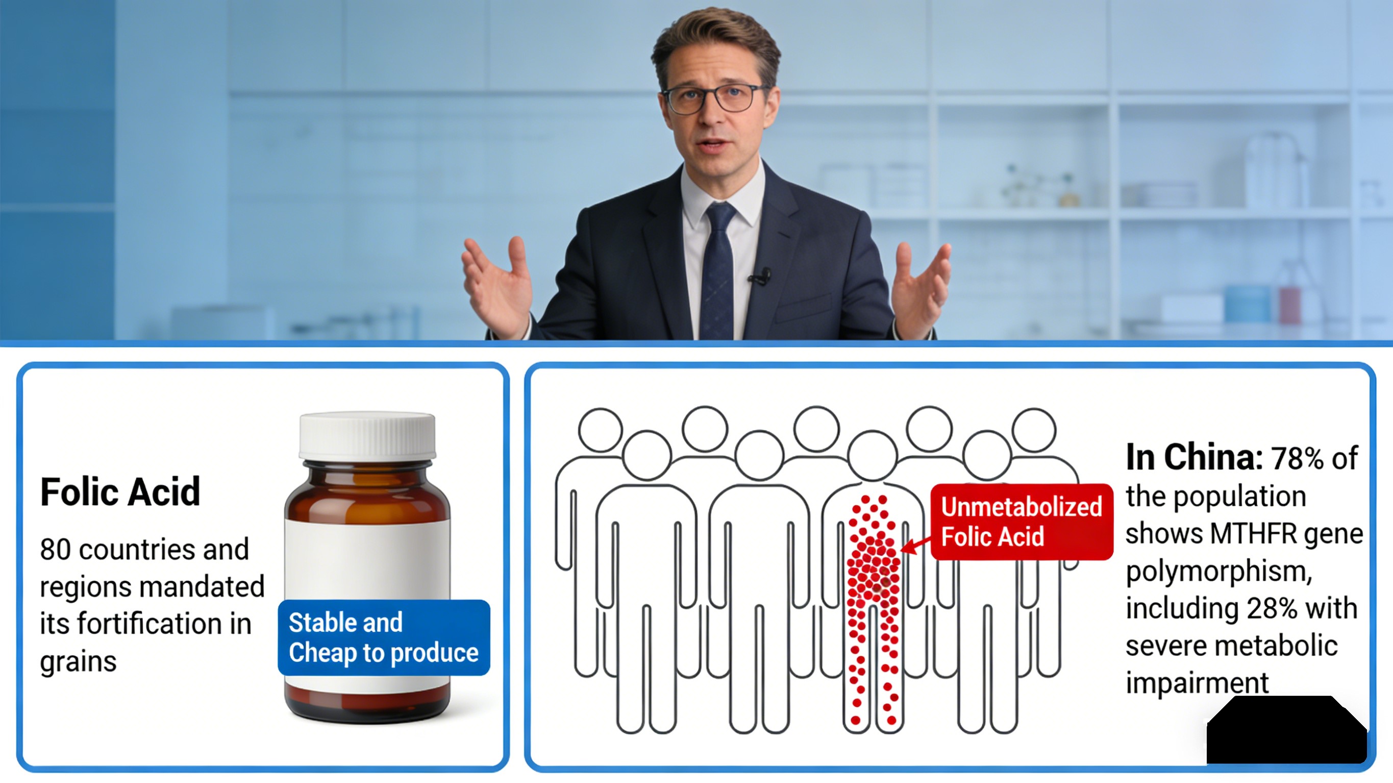 На практиці майже 30% китайців не може ефективно перетворювати фолієву кислоту, що призводить до неефективності добавок і потенційне накопичення неметаболізованої фолієвої кислоти, яка може маскувати дефіцит вітаміну B12 і перешкоджають засвоєнню цинку. Для компаній це означає скарги споживачів і репутаційний ризик.