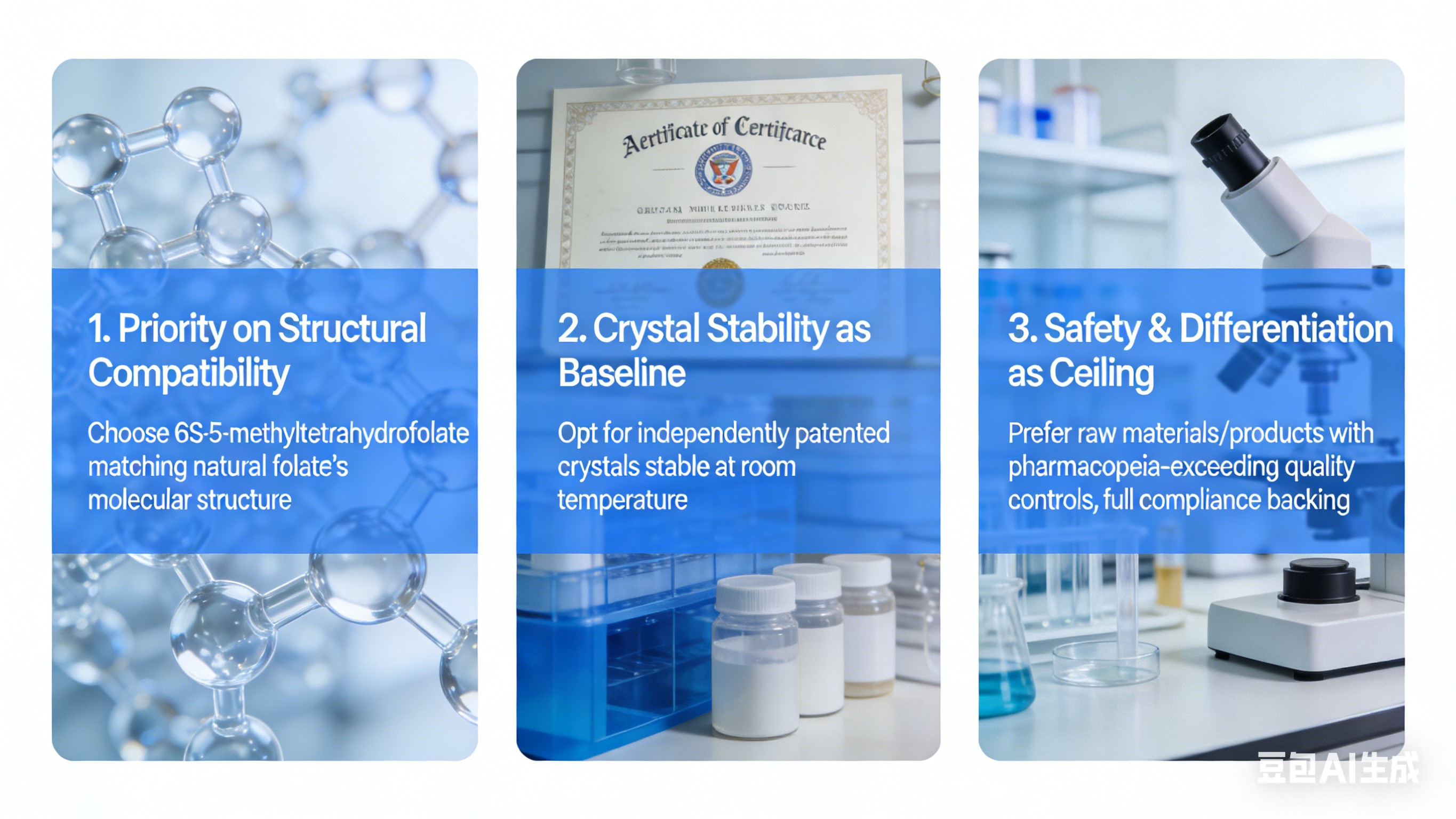 1. Пріоритет структурної сумісності: Виберіть відповідність 6S-5-метилтетрагідрофолату природна молекулярна структура фолату — пряме всмоктування, охоплює все користувачів, запобігає неефективності.2. Кристалічна стабільність як базова лінія: Вибирайте незалежно запатентовані стабільні кристали при кімнатній температурі, щоб забезпечити консистенцію партії та претензію на етикетці відповідність.
